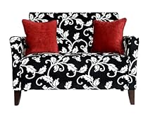 At the time of this writing, the picture shown here is quite photoshopped to make the colors much brighter than they are. It seems the manufacturer decided it wouldn't be able to sell the item if you knew ahead of time what it REALLY looked like. The pillows- rather than being red are actually more of a rust color; The white part of the fabric is not really white, but a dirty white or creamish-grey color. So if you're looking to match this with some white pieces you have you'll likely be disappointed. The dull colors result in the couch not looking new, but somewhat old. In fact I've had two people see the couch ... angelo:HOME Sutton designer Loveseat has a slightly flared styled arm and luxurious foam and polyester fiber seating for exceptional comfort, Designed by Angelo Surmelis creator of a new generation of Modern Classic furniture that combines modern lines with traditional details, Loveseat is covered in a black woven fabric with a white chenille vine pattern, Angelo has included two decorative pillows, Solid wood frame is glued and corner blocked, Extra thick high resilient back cushioning is filled with high loft polyester fiber ensuring