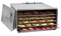 TSM Products Stainless Steel Food Dehydrator with 5 Stainless Steel Shelves I have recently purchased this dehydrator after looking at reviews for other machines. I must say that I did not expect to have it running almost non-stop. Thinking of new items to dehydrate. I am particualrly fond of the banana chips I give to my pet. She looks at the machine with her mouth watering.I am happy that I purchased the all stainless steel as over time, it will hold up to hours and days of use. I was a bit surprised at the size even though the dimensions were given. It is larger than a small microwave. Fits nicely under kitchen ... Easily makes great tasting natural snacks like jerky, fruit leathers, apple chips or any of your favorite dried fruits or vegetables Compact 5 tray design, 22ga - 304 food grade stainless steel construction, will not rust Innovative rack design allows for thorough cleaning of interior 800 watt heating element and fan creates horizontal air flow Maintains even