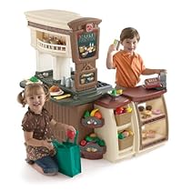 Purchased this toy for my 3 year old granddaughter. It is super cute and has a lot of cool features (lights and sounds, came with a nice supply of food, pots and pans). She can play supermarket or kitchen or cafe and she loves using the cash register to ring you up. I forsee this bringing years of fun. One critique, it is a PAIN to set up. It has about 20 steps and the holes for screws are not pre-drilled. Allot at least two hours for set up because forcing a three year old to wait for their present is not fun. Also, the stove top is a bit slick and the pots and pans tend to slide off.See ... The market includes a see-thru baker’s display case, shelving, and produce bins Trendy colors and decals give a realistic feel comparable to today's coffee shops, organic grocery stores, and bakeries Also included is a 47-piece accessory set includes 2 place